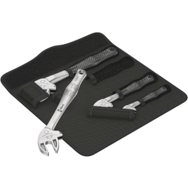 Veel gebruikers zouden graag willen beschikken over een universeel gereedschap dat voor zoveel mogelijk zaken te gebruiken is. Eén stuk gereedschap voor meerdere metrische en duimse maten. En dit zou zich dan ook nog eens automatisch aan de verschillende schroefmaten moeten aanpassen. Veilig vastgrijpen, niets beschadigen en een hoge werksnelheid mogelijk maken. Middels de traploos en parallel lopende bekken worden meerdere steeksleutelformaten vervangen. De vereiste maat wordt automatisch bij het aanzetten op de zeskantmoer en schroef ingesteld. Het geïntegreerde hefboommechanisme klemt de zeskantschroef resp. -moer tussen de bekken veilig in, hetgeen het risico op wegglijden en beschadigingen aanzienlijk verkleint. De ratelfunctie maak snel en soepel schroeven zonder telkens het gereedschap te moeten verplaatsen mogelijk. Door toepassing van hoekprisma's wordt een terughaalhoek van slechts 30° gerealiseerd. De 1-zijde-constructie in combinatie met de ratelfunctie en het hoekprisma maakt werken in krappe ruimtes mogelijk. De instelbare Joker 6004 is hét universele schroefgereedschap. Zelfinstellend. Vastgrijpend. Ratelend. Vierdelige set voor tenminste 18 verschillende metrische en duimse schroefbits in compact vouwetui. De etuis kunnen dankzij klittenband aan de achterzijde worden bevestigd aan wanden, rekken, gereedschapswagens en het Wera 2go systeem.